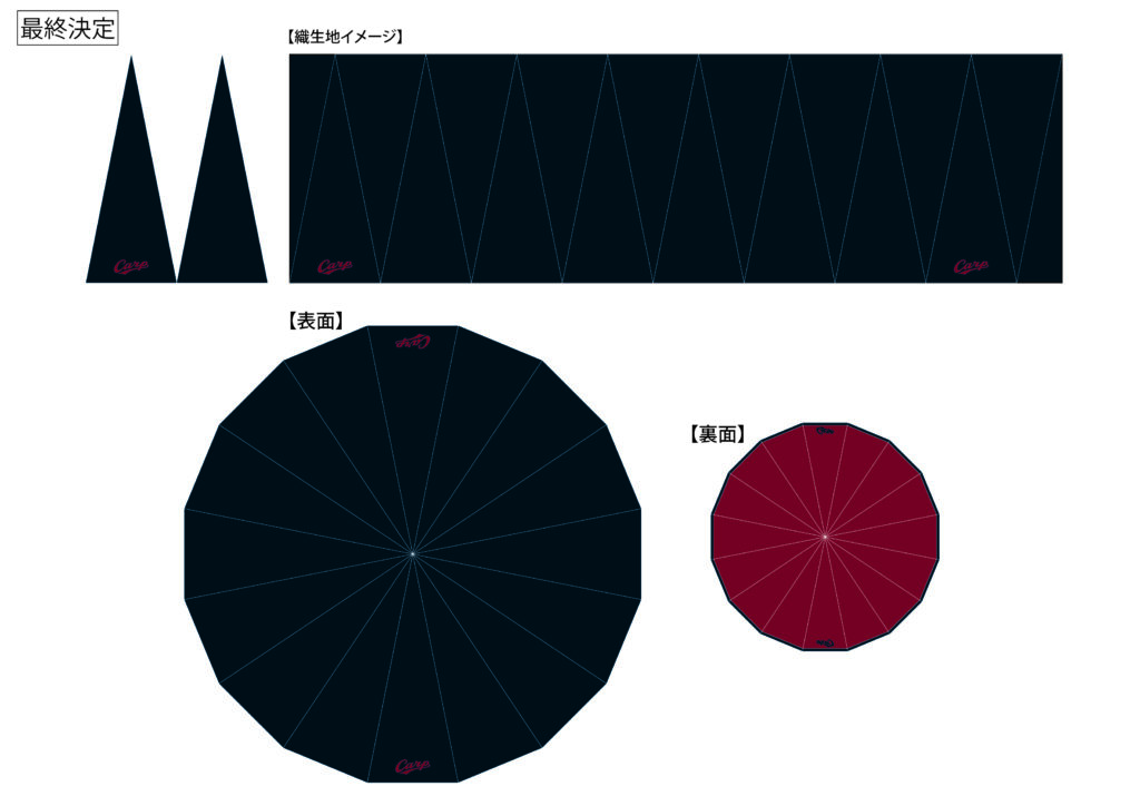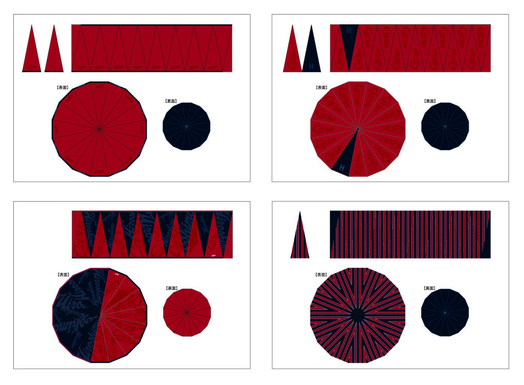傘の生地のデザインのしくみは下図のようになっており、長方形の布を三角形に裁断し、縫い合わせて円形にしていきます。
