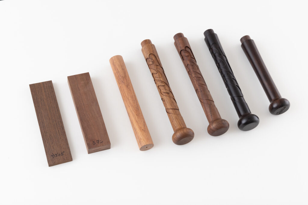 「黒檀」の重厚感のある輝きで存在感を示す「手元」のバット、