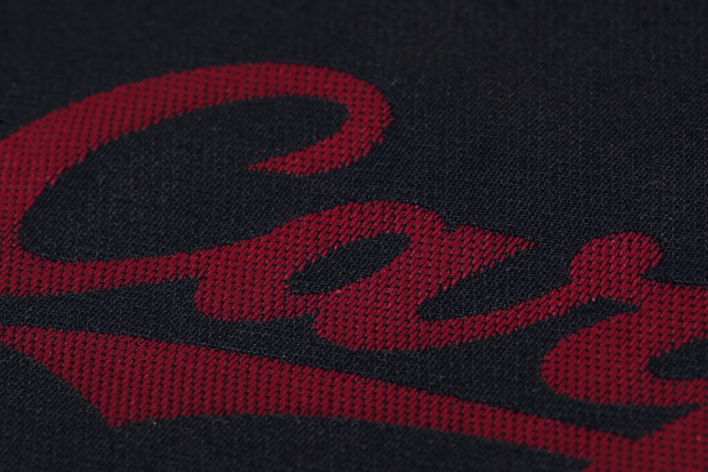 生地に織り込まれた、見る角度によって表情の変わるCarpロゴ、