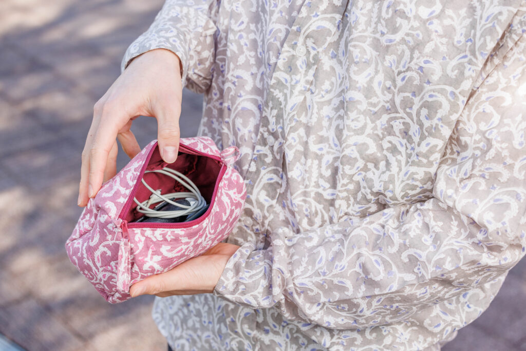 見た目からもインドを感じてもらうため、現地でよく見かけたキルティング生地のポーチを参考に作りました。