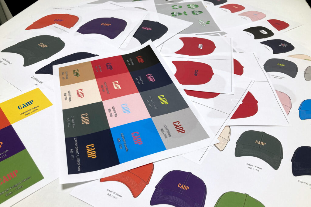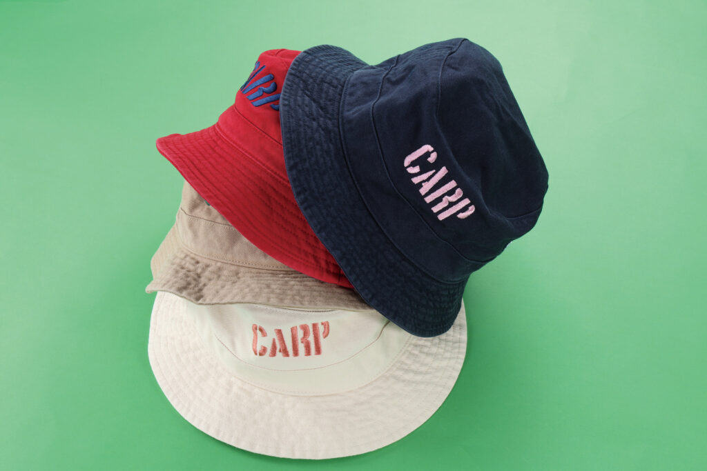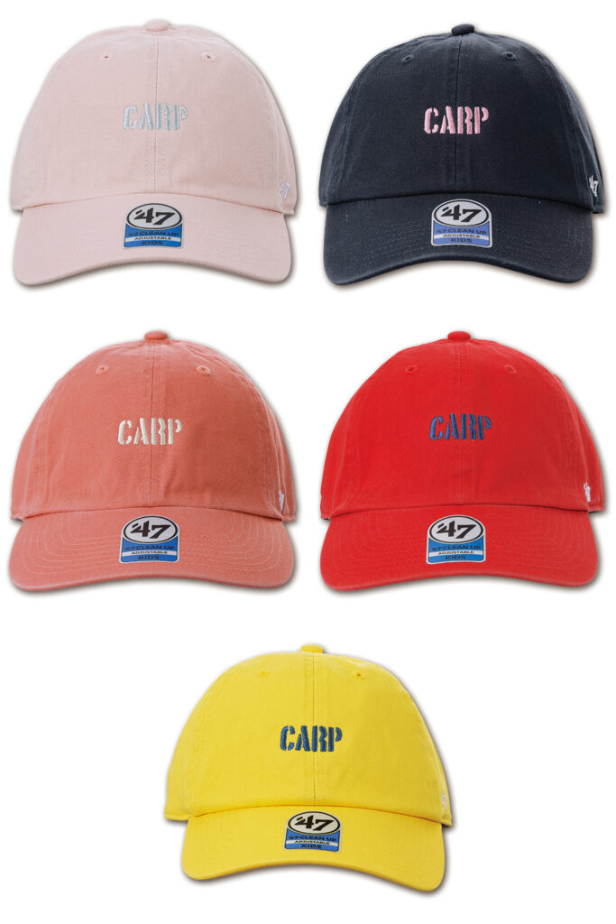 今年は4色展開で、「ミニロゴキャップ」と同じくステンシル文字のCARPロゴを刺繍しました!