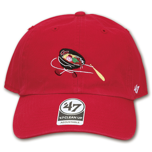 球場グルメの“主砲”「カープうどん」に手足が生え、豪快なスイングを見せる「カープうどんくんキャップ」