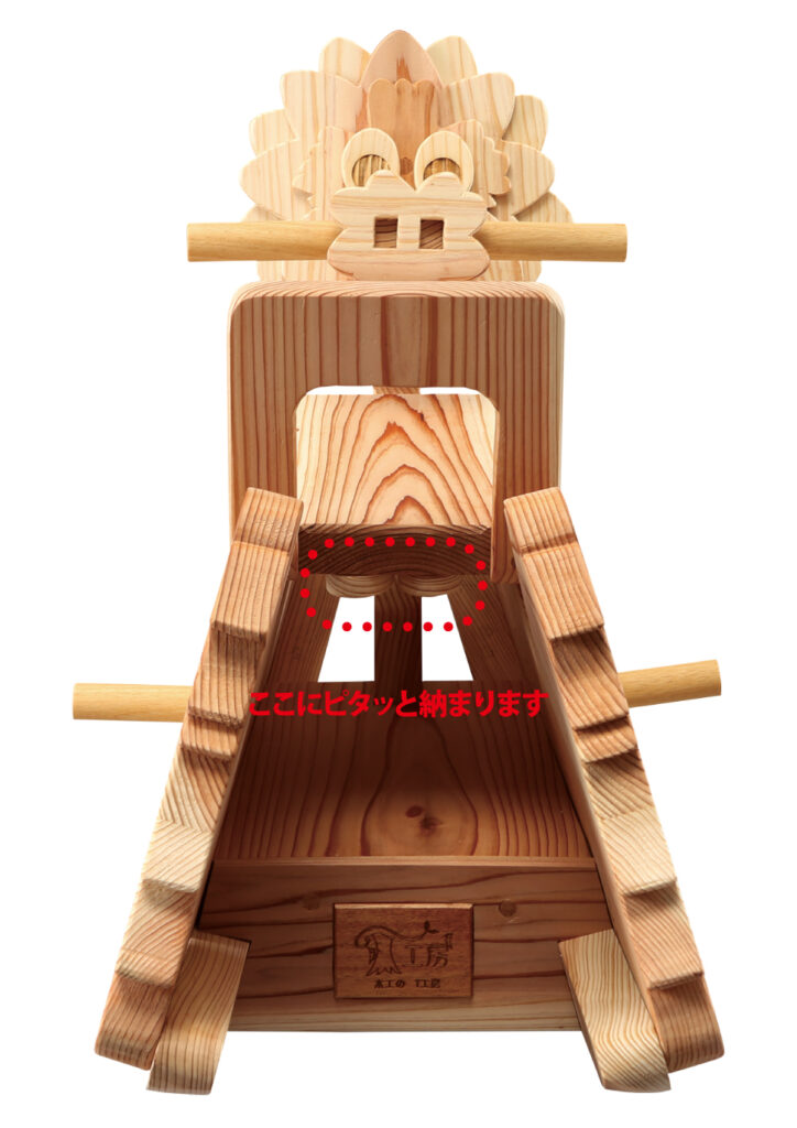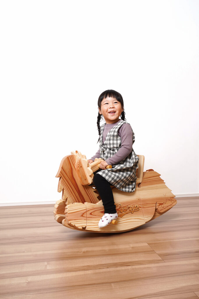「Carp」のロゴまでも木製 安心安全な構造と素材を用い、ゆらゆらと優しく揺れるスラィリー。杉の木目も美しく…。それでもう充分誇らしいのに、さらにもう一つ、とっておきの大きな自慢があるのです!これには流石のファラオも二度目のびっくり!